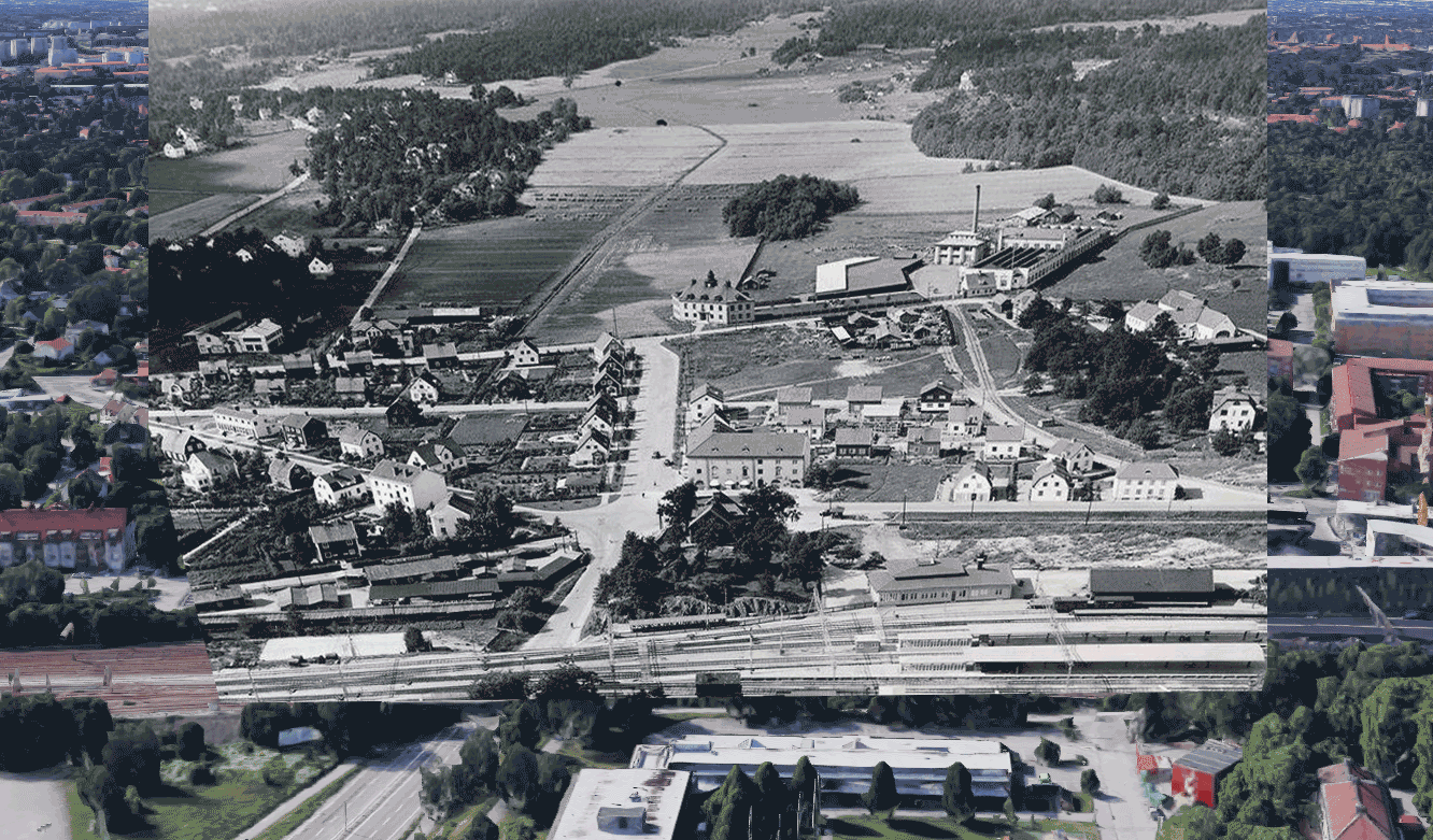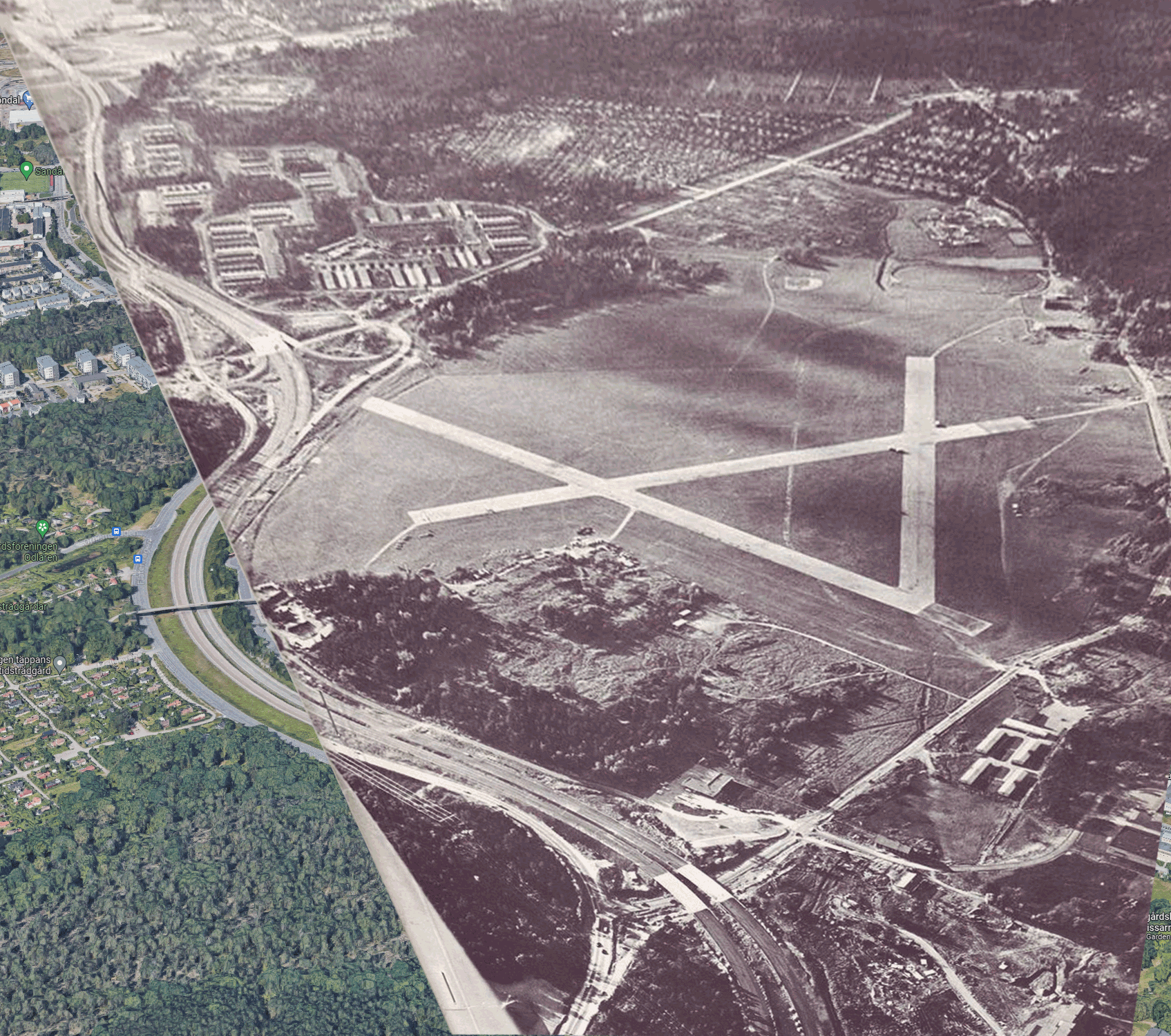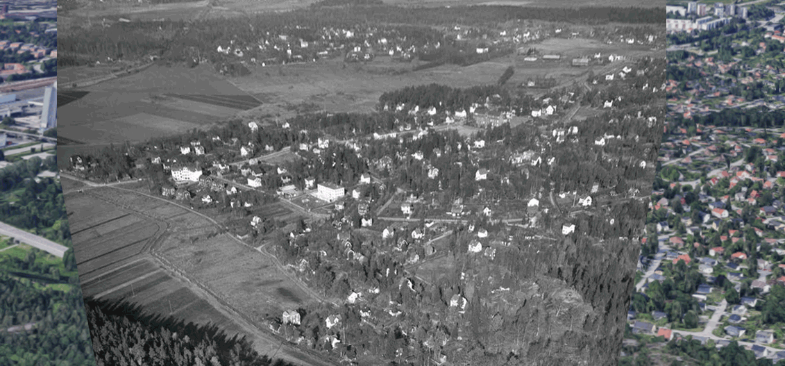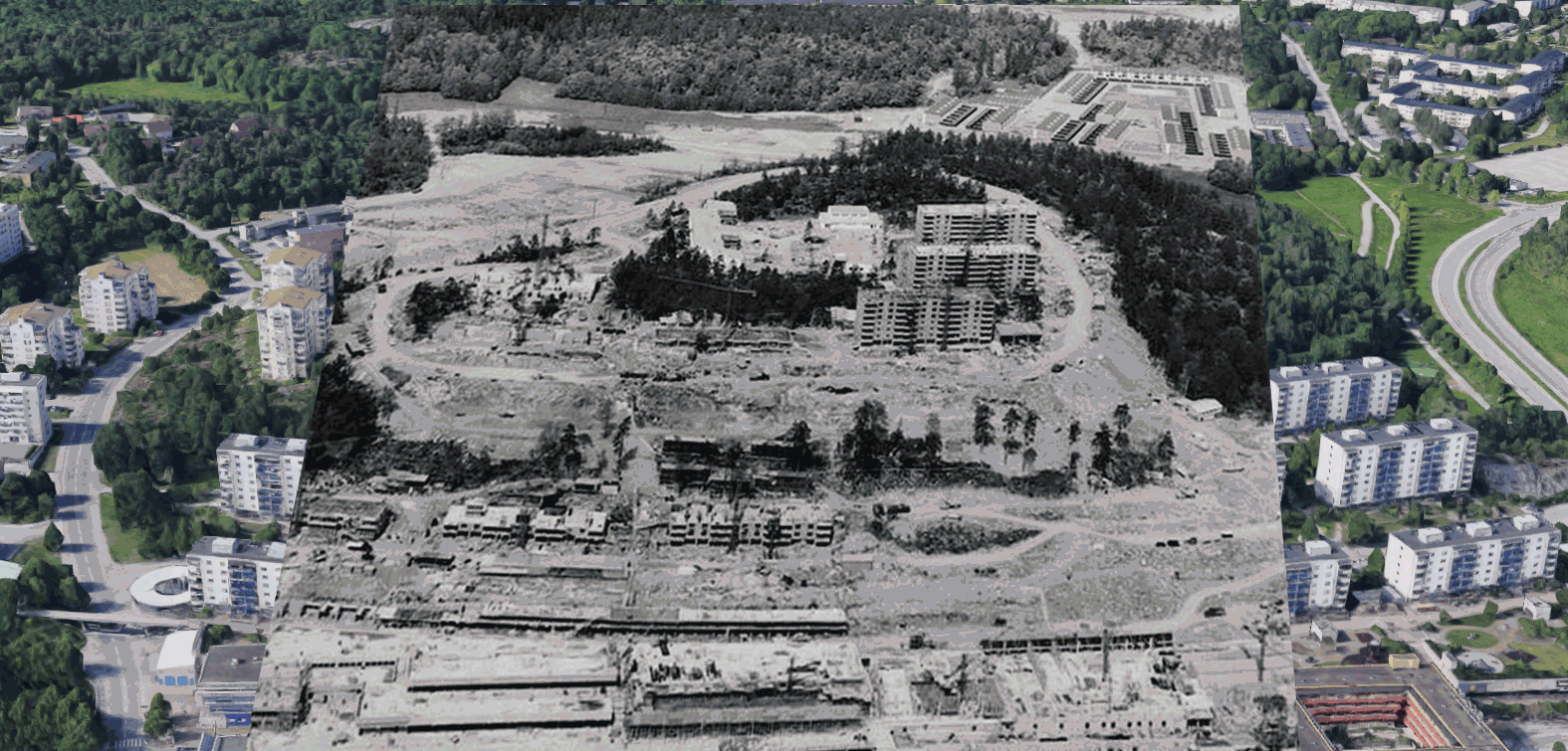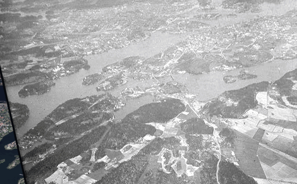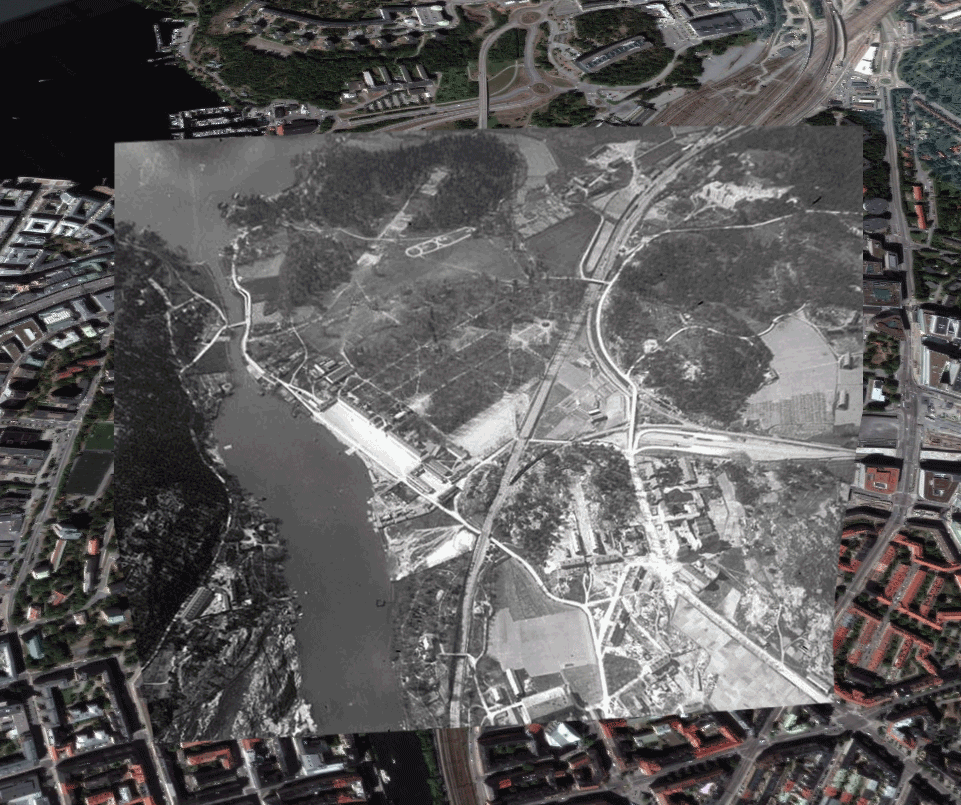 Gamla flygbilder som överlagras med hur det ser ut idag med hjälp av Google Maps. Foton från Stockholmskällan och Wikipedia.