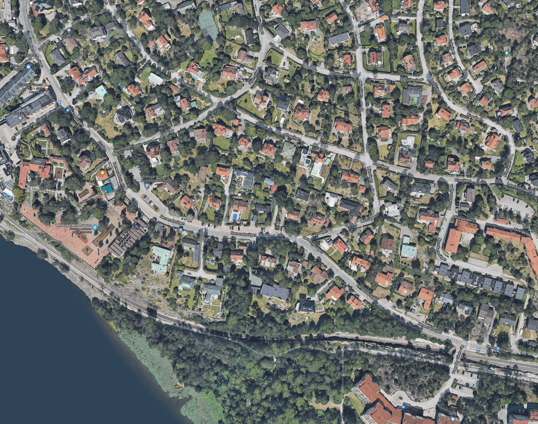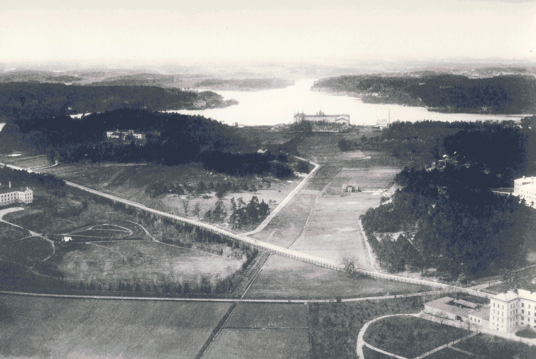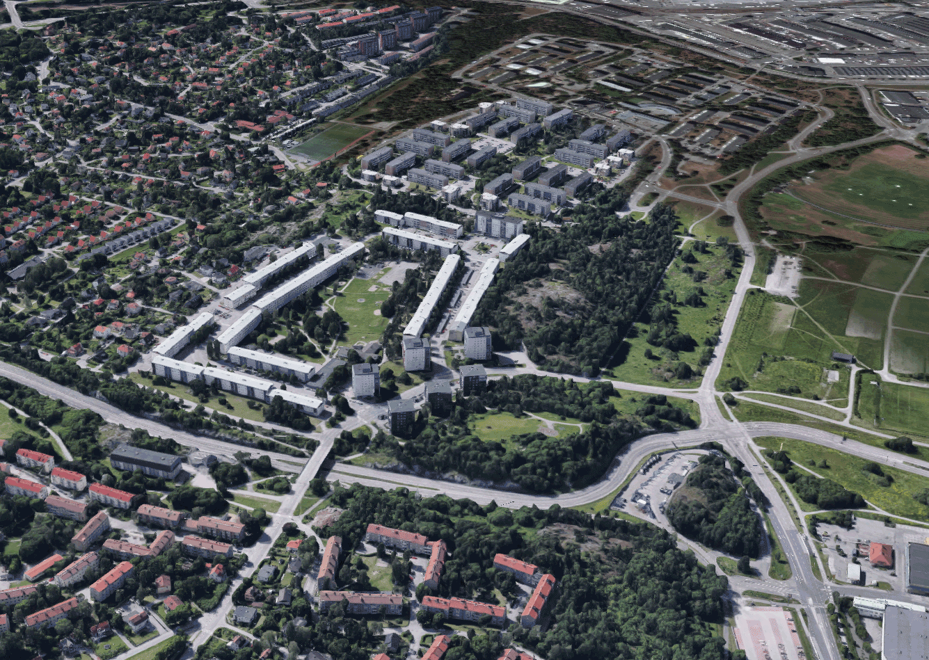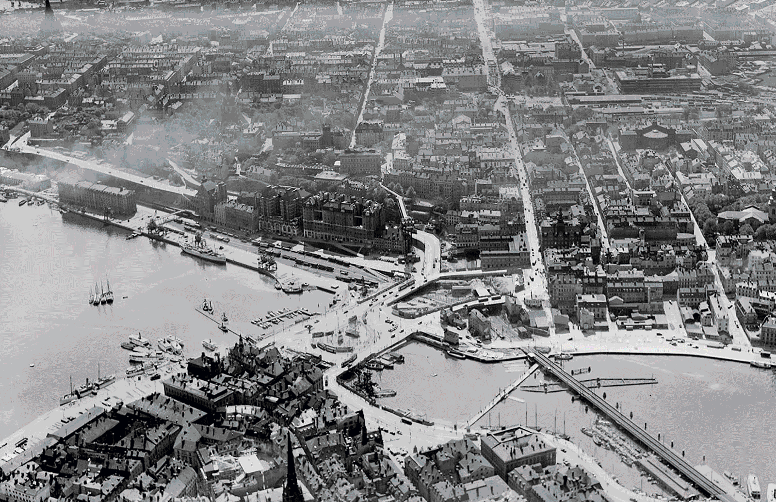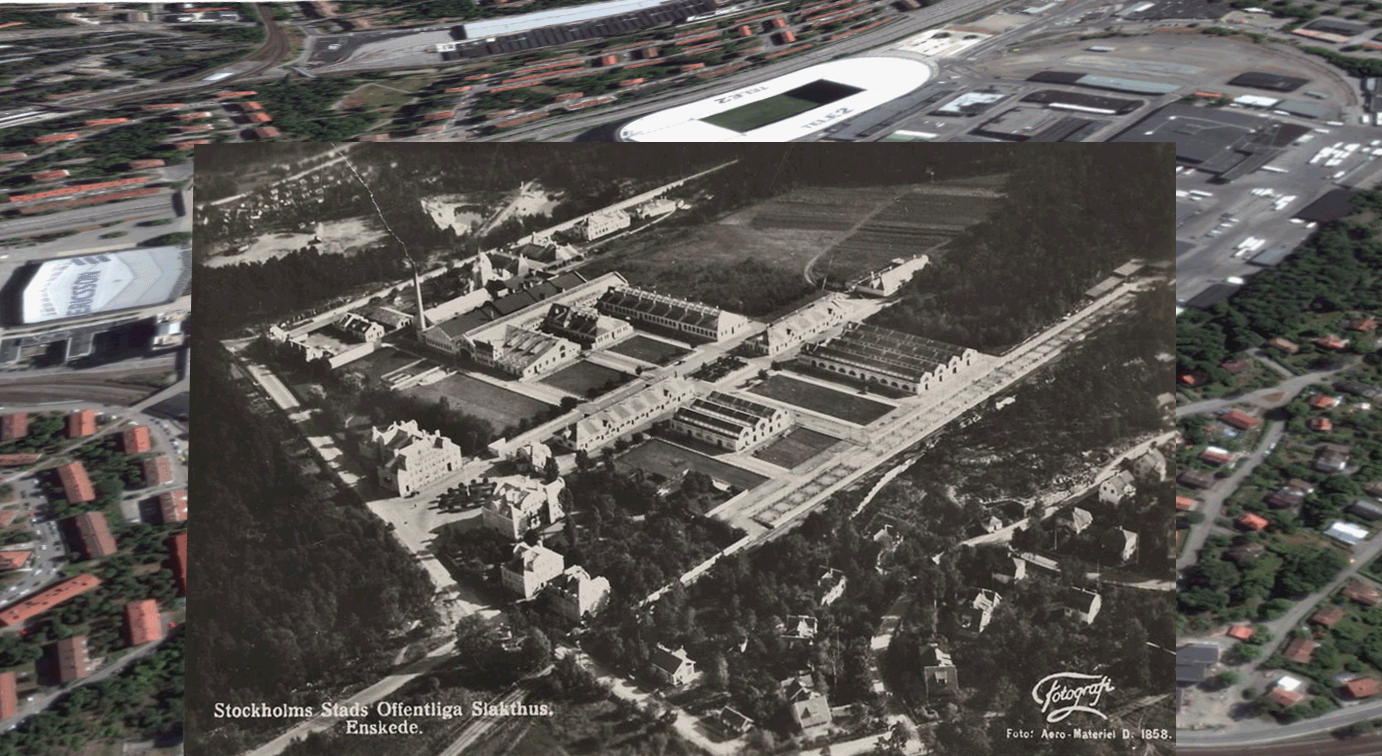 Gamla flygbilder som överlagras med hur det ser ut idag med hjälp av Google Maps. Foton från Stockholmskällan och Wikipedia.